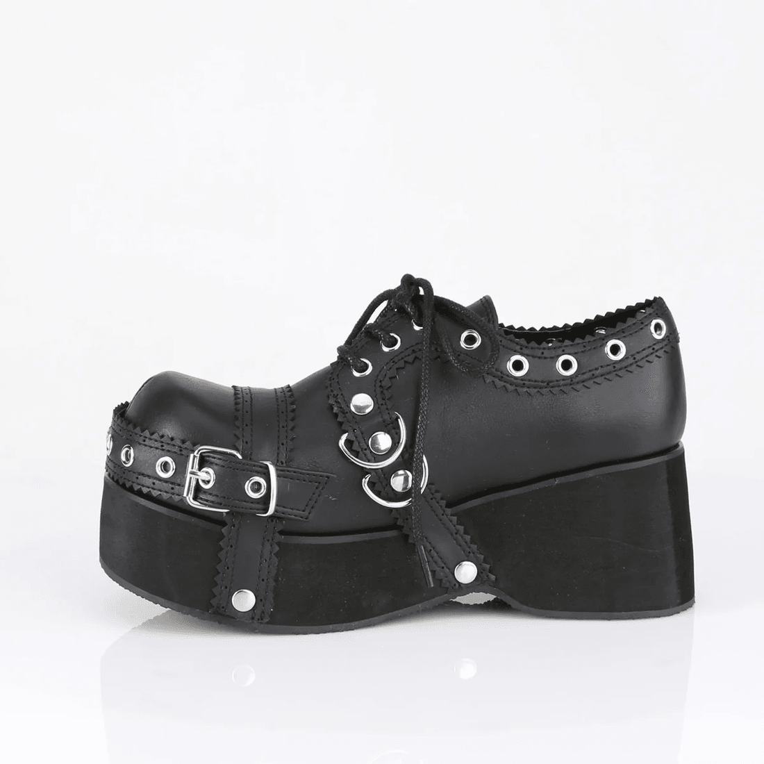Step into bold fashion with the Demonia Cult Dank-28 Black Vegan Leather. This striking lace-up oxford shoe is designed for those who dare to stand out. With a 3 1/4" platform, you'll gain height effortlessly while showcasing your unique style.
