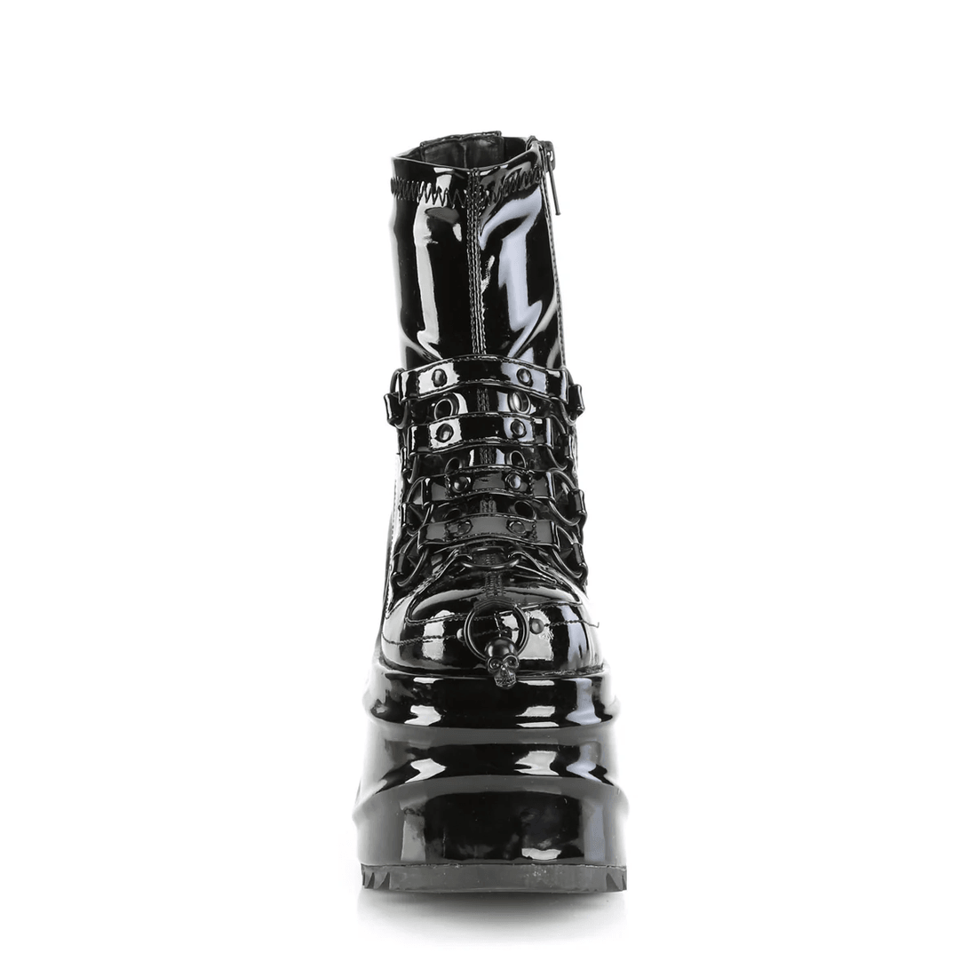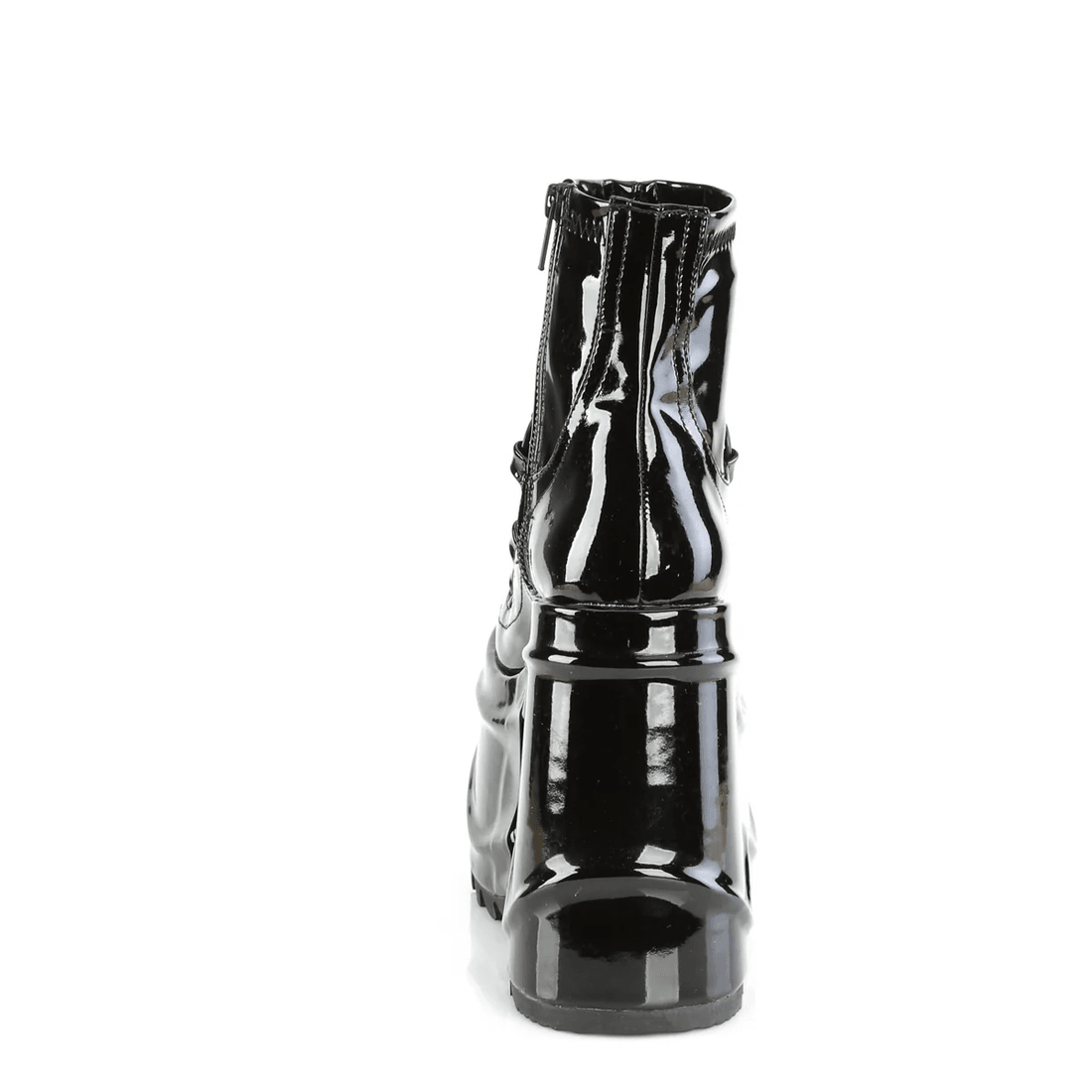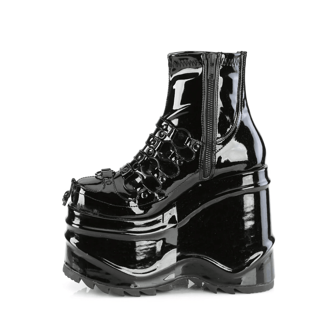 demonia Cult Wave-110 Zwarte Patent Enkellaarsjes. Deze Verbluffende 6-inch Wedge Platform Laarzen Zijn Ontworpen Voor Degenen Die Een Gedurfde Mode-uitspraak Willen Maken. Perfect Vervaardigd Met Ingewikkelde Details, Belichamen Ze De Geest Van Punkstijl Terwijl Ze Ervoor Zorgen Dat Je Opvalt In Elke Menigte.