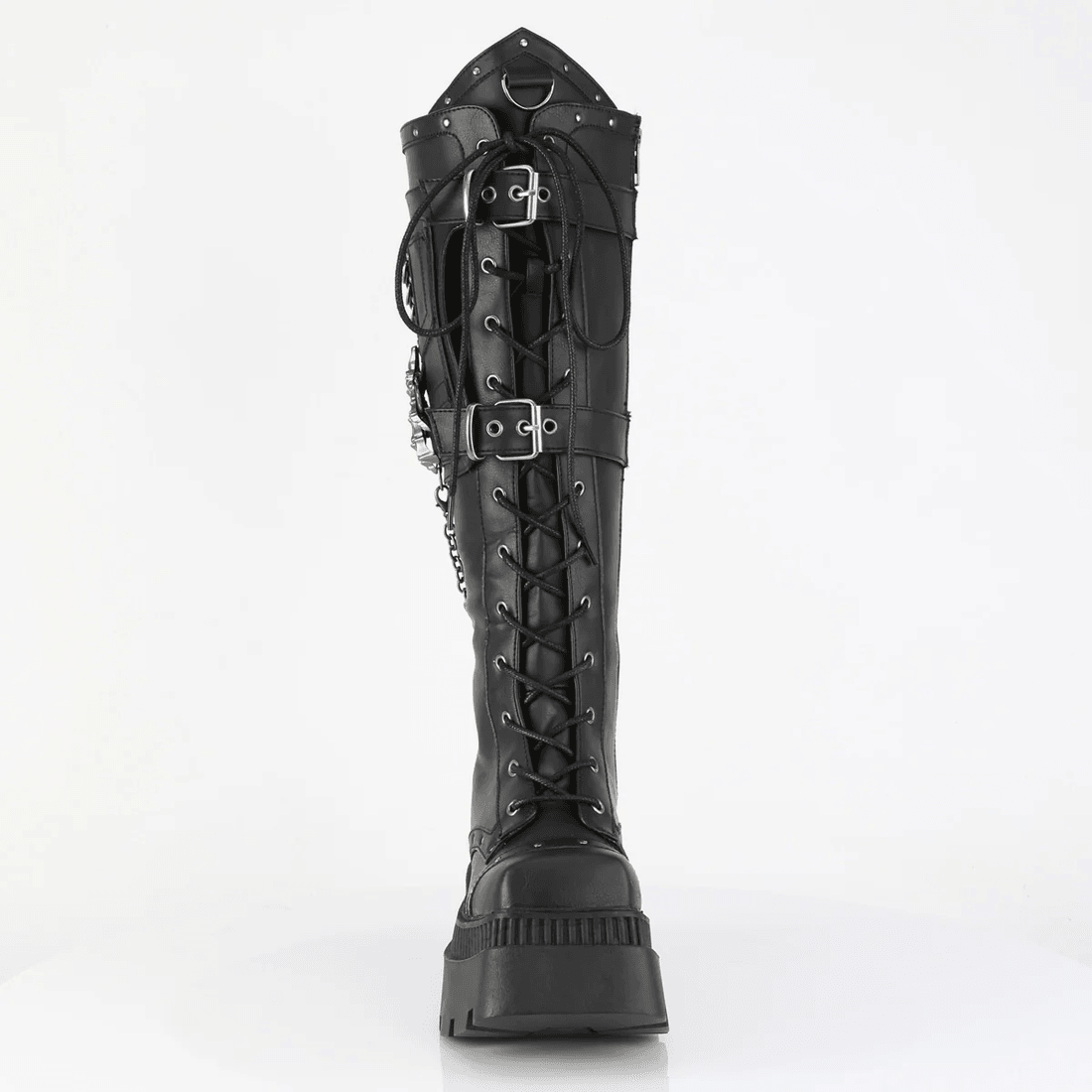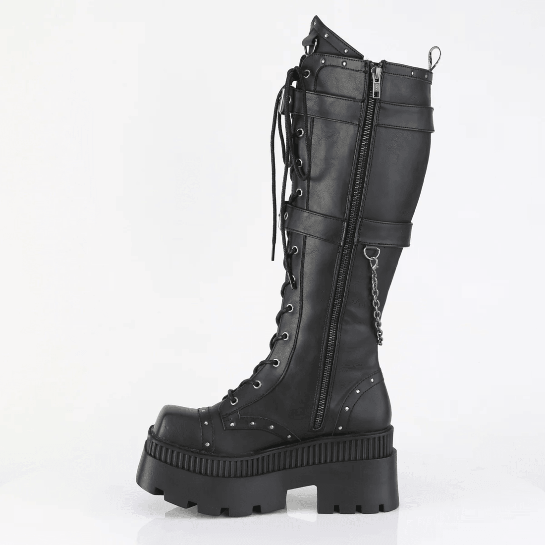 trå Inn I Rampelyset Med demonia Cult Wrath-205 Svarte Veganske Lær Støvler, Designet For De Som Tør å Gjøre Et Statement. Med Sitt Edgy Design Og Slående Detaljer, Er Disse Knelange Støvlene Perfekte For å Snu Hoder Og Uttrykke Din Unike Stil.