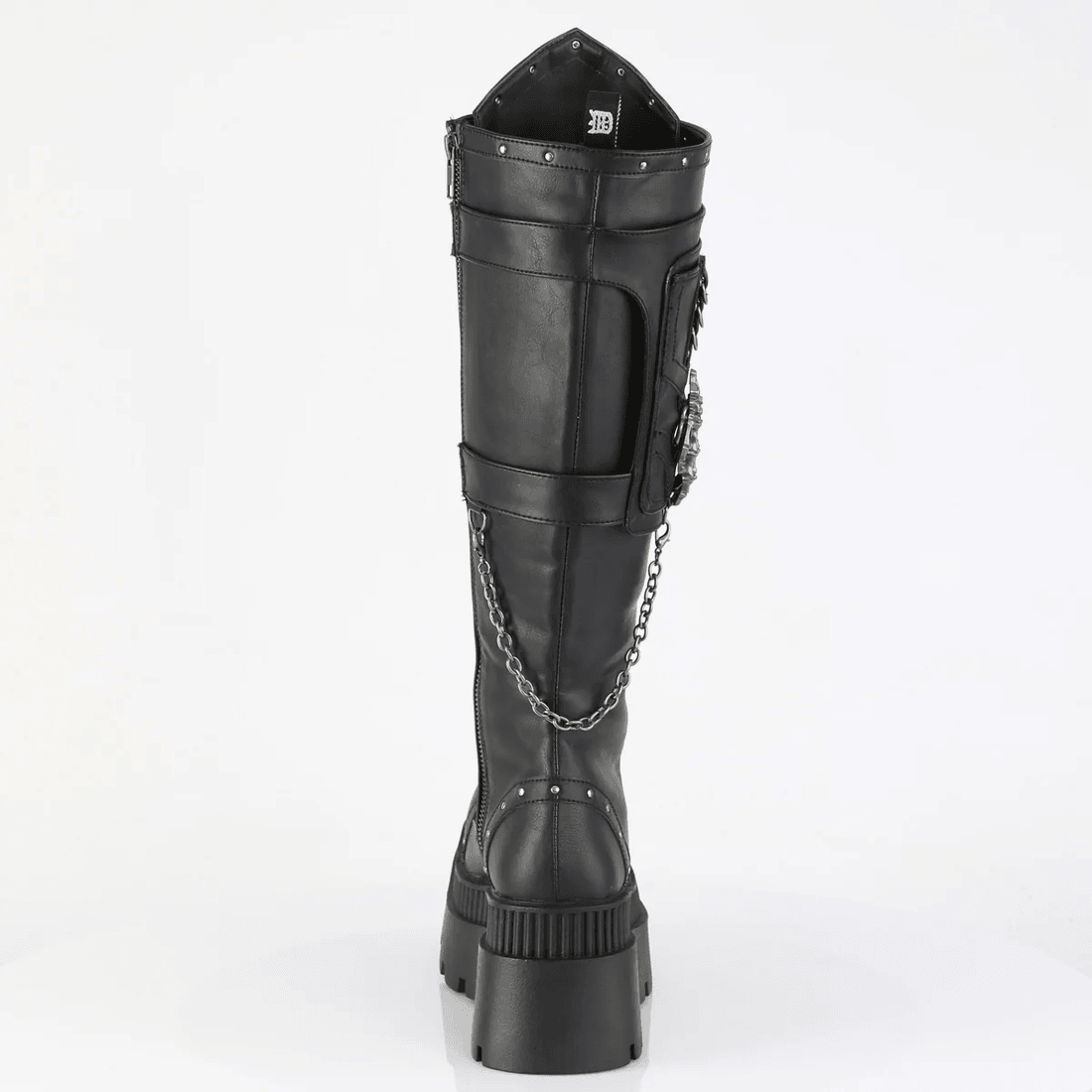 demonia Cult Wrath-205 Støvlene Har En Kraftig 3 1/4" Hæl Som Hever Utseendet Ditt Samtidig Som Den Gir Solid Støtte. Snør Dem Godt Og Nyt De Unike Detaljene, Inkludert En Funksjonell Spenne Cargo Sidelomme Og Slående Hodeskallehånd Ornamenter Som Tilfører Personlighet Til Hvert Antrekk. De Hengende Kjededetaljene Og Naglede Aksenter Gir Disse Støvlene En Intens Kant, Og Sikrer At Du Skiller Deg Ut I Enhver Mengde.