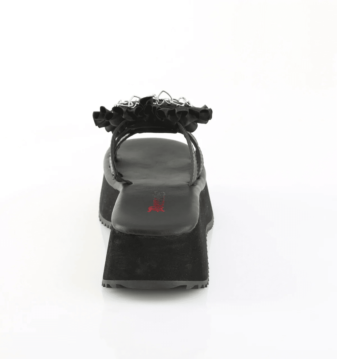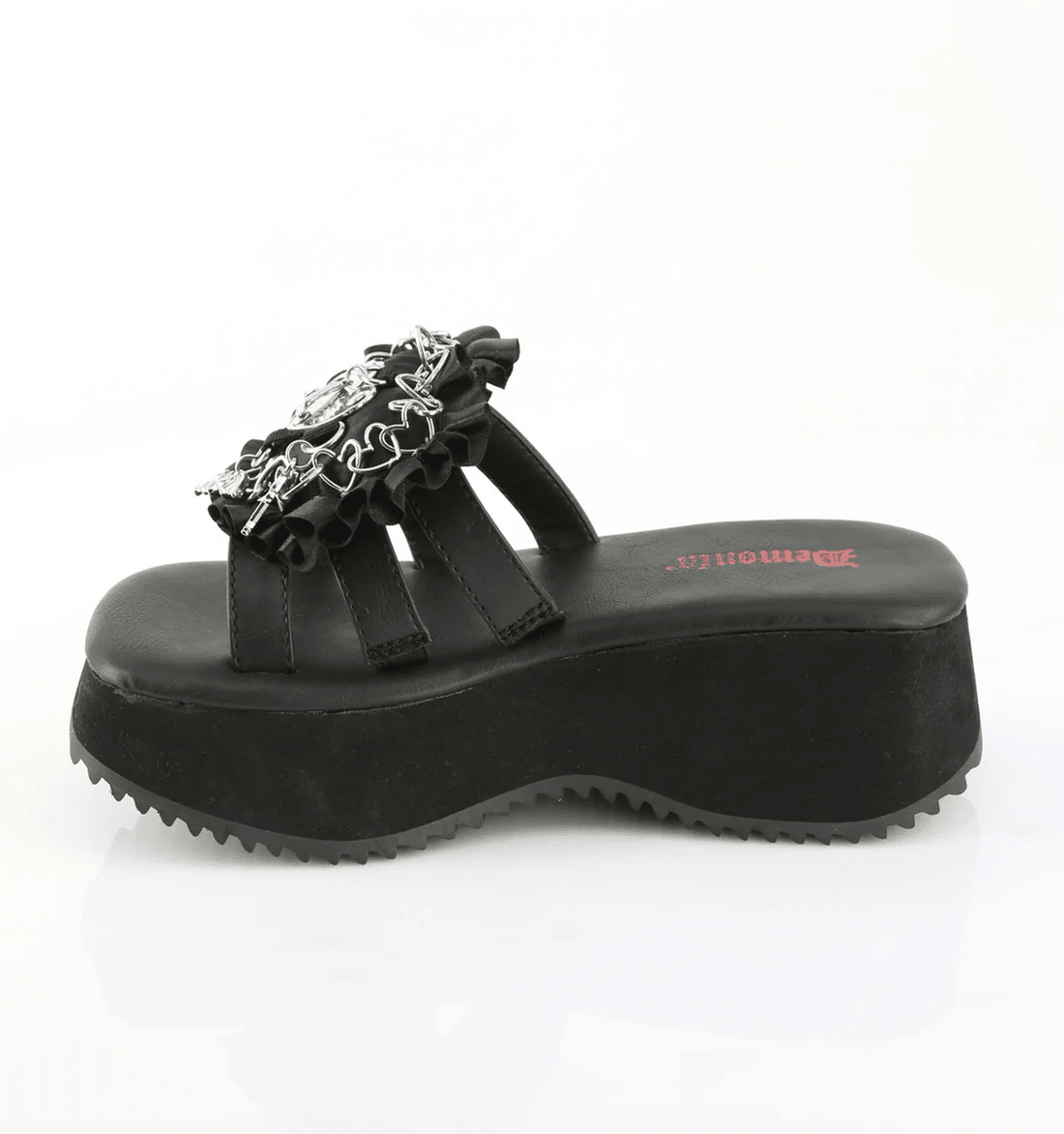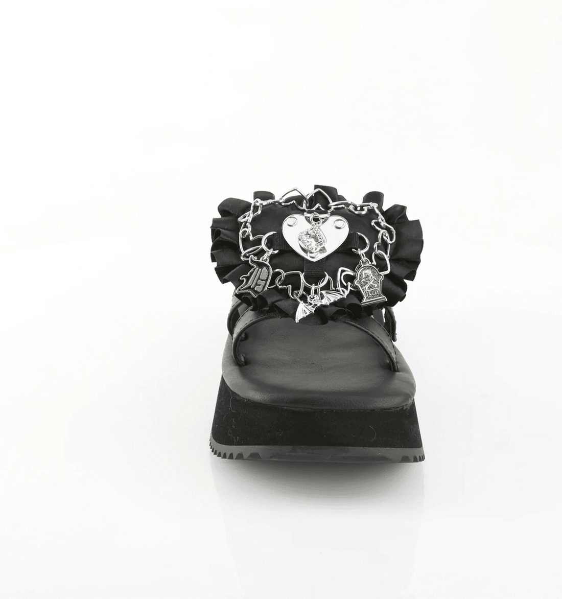The Demonia Cult Flip-16 sandals are crafted from high-quality black vegan leather-satin, ensuring both durability and style. The ruffled heart pillow not only adds a flirty touch but also provides extra comfort. With a sleek metal heart plate at the center, these sandals are designed to catch the eye and elevate your summer wardrobe.