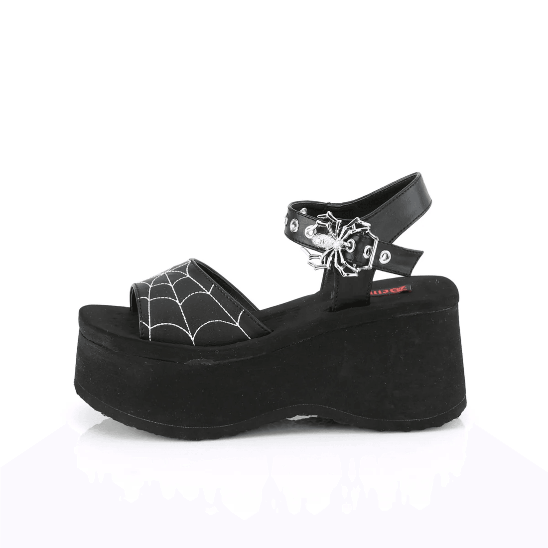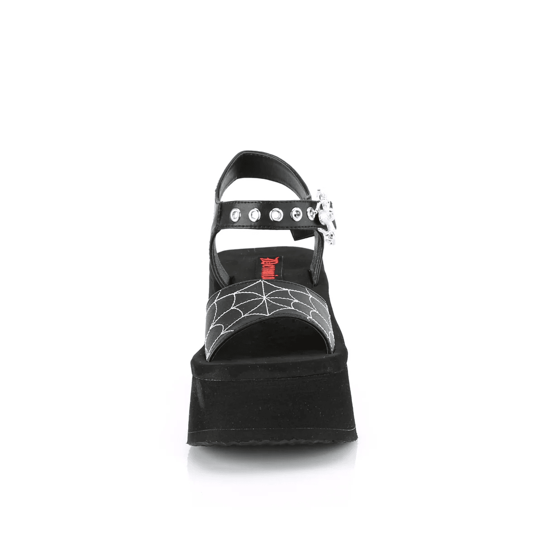 The Demonia Cult Funn-10 sandals combine edgy style with comfort. The captivating spider web embroidery on the vamp creates a unique visual appeal, while the ankle strap with a whimsical spider buckle ensures a secure fit. Not only do these sandals elevate your look, but they also reflect your commitment to sustainable fashion.