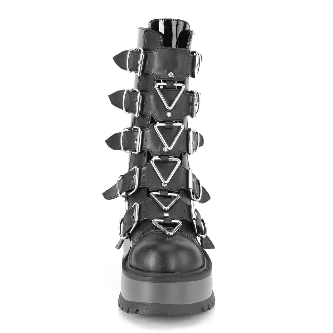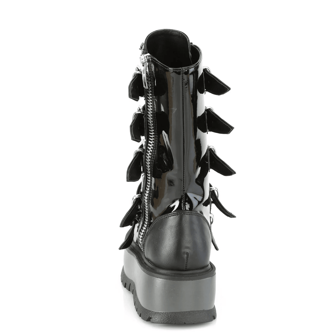 trå Inn I Dristig Mote Med demonia Cult Slacker-160 Svart Patent-vegansk Lær Støvlene. Designet For De Som Tør å Skille Seg Ut, Kombinerer Disse Midtleggs Støvlene Sterke Estetikk Med Hverdagsfunksjonalitet.