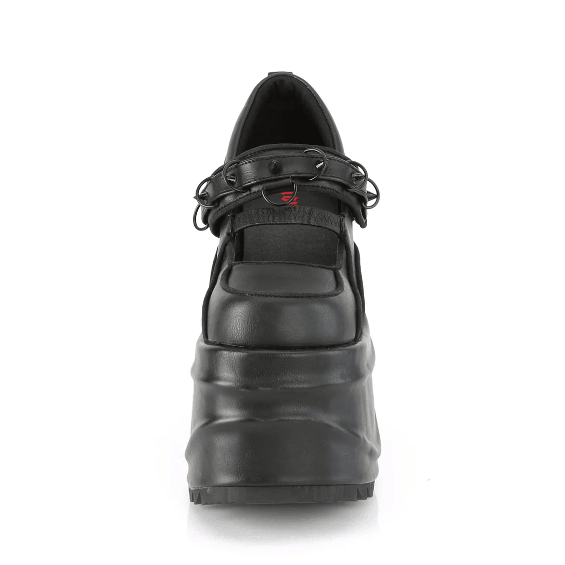 Step into the spotlight with the Demonia Cult Wave-48 Black Vegan Leather shoes, where punk rock aesthetics meet modern design. These striking maryjanes are perfect for fashion-forward individuals looking to make a bold statement.