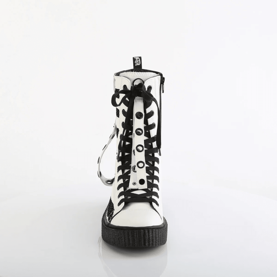 Step up your streetwear game with the Demonia Cult Sneeker-325 White Vegan Leather-Fishnet. This stunning mid-calf sneaker boot fuses edgy style with exceptional comfort, making it a must-have for any fashion-forward individual.