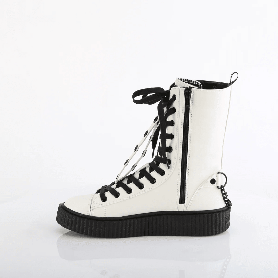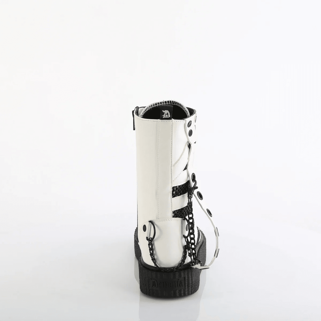 The Demonia Cult Sneeker-325 is where urban style meets a daring twist. With its bold striped side panels and industrial-chic hanging chain accents, these sneaker-boots are anything but ordinary. The sleek white vegan leather, complemented by subtle fishnet details, adds a touch of sophistication to any outfit.
