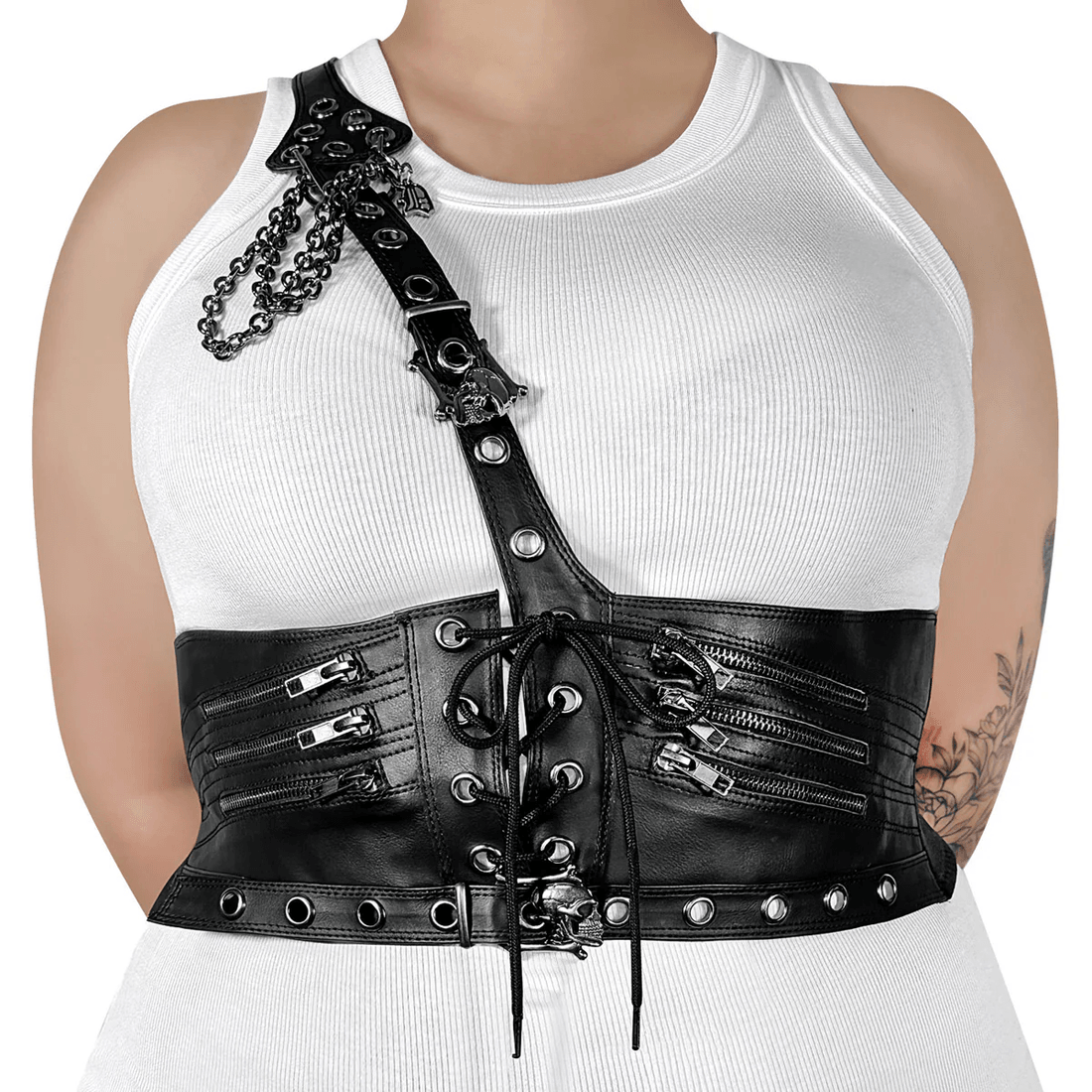 The Demonia Cult Demonia Waist Harness is not just a fashion statement; it's a versatile piece that can enhance any outfit. Whether you're dressing up for a concert, a festival, or a night out, this harness adds an edgy touch that stands out. The adjustable straps allow you to create the perfect silhouette, while the unique front lacing and ornamental zipper provide a bold aesthetic that captures attention.