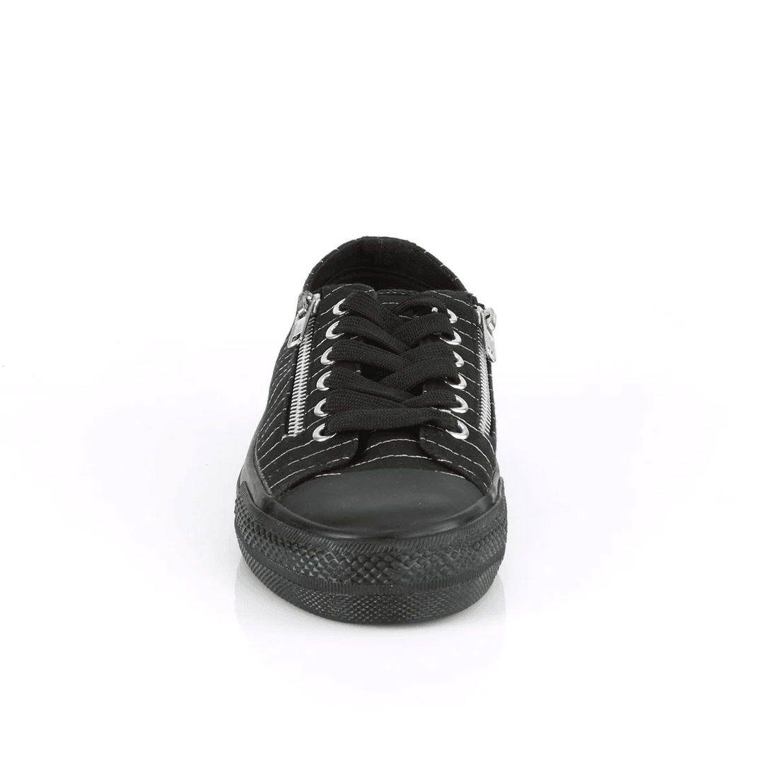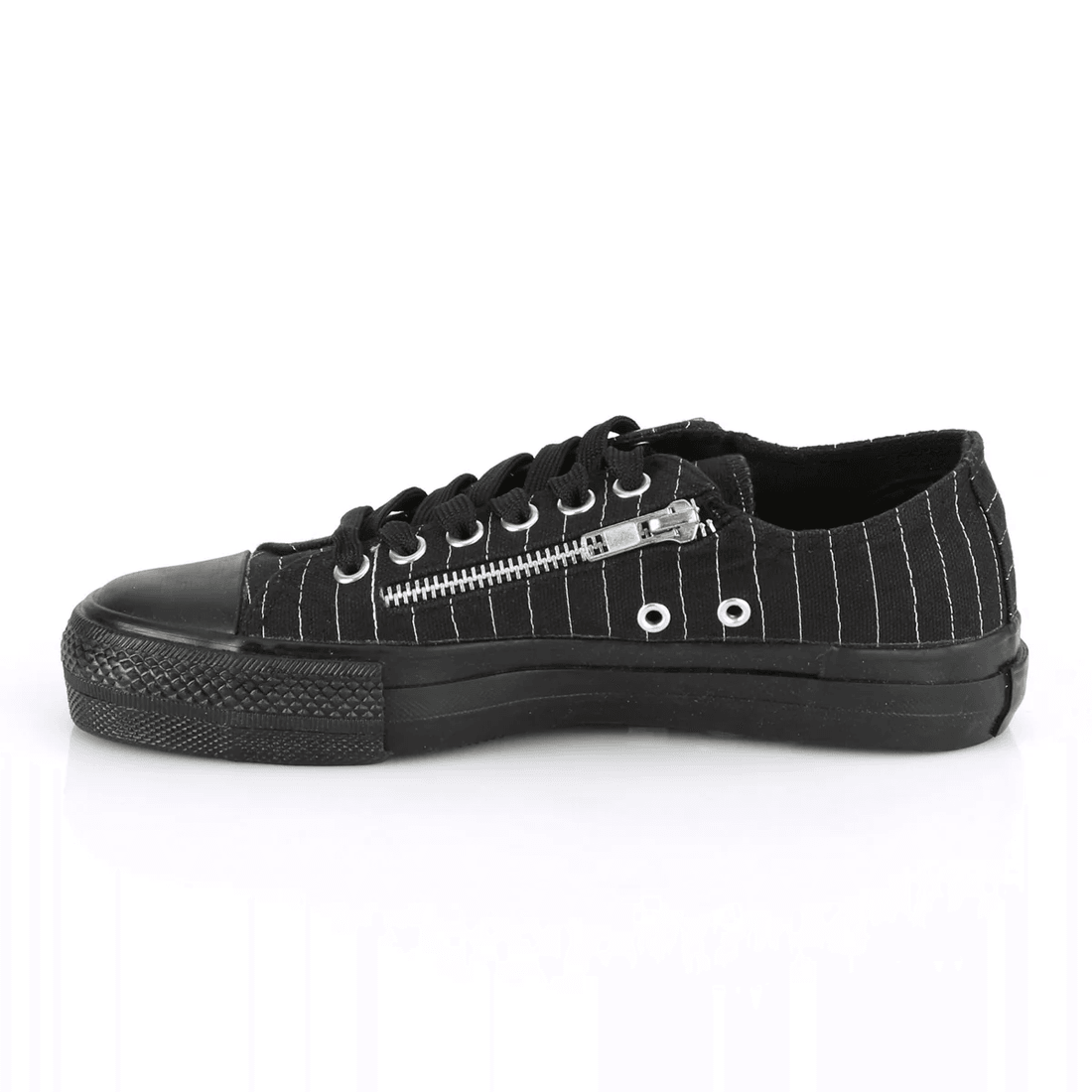 Introducing the Demonia Cult Deviant-06 Black Canvas-White Pinstripes, a must-have low-top sneaker that combines edgy fashion with unparalleled comfort. Exclusively available at demoniacult.com, this limited edition sneaker will not be restocked once sold out. Grab your pair now and make a bold statement!