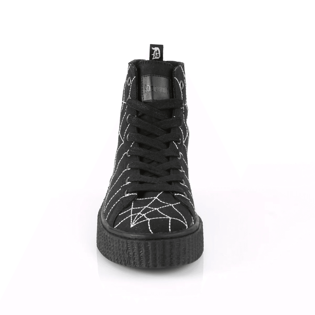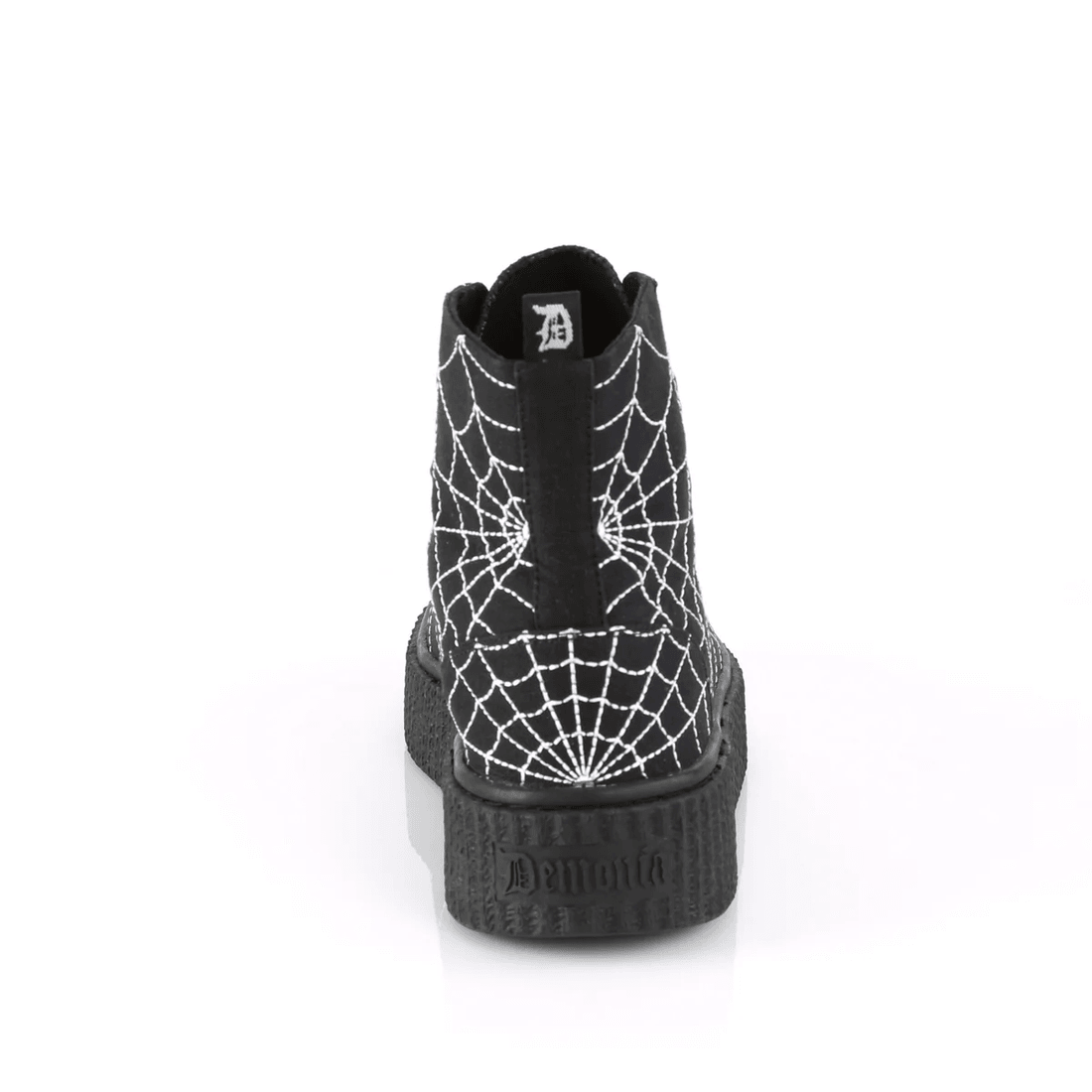 Step into a world of unique fashion with the Demonia Cult Sneeker-250 Black Canvas. This high-top creeper sneaker is designed for those who dare to stand out. With a striking embroidered spider web detail, these sneakers add a sense of mystery and adventure to any outfit.
