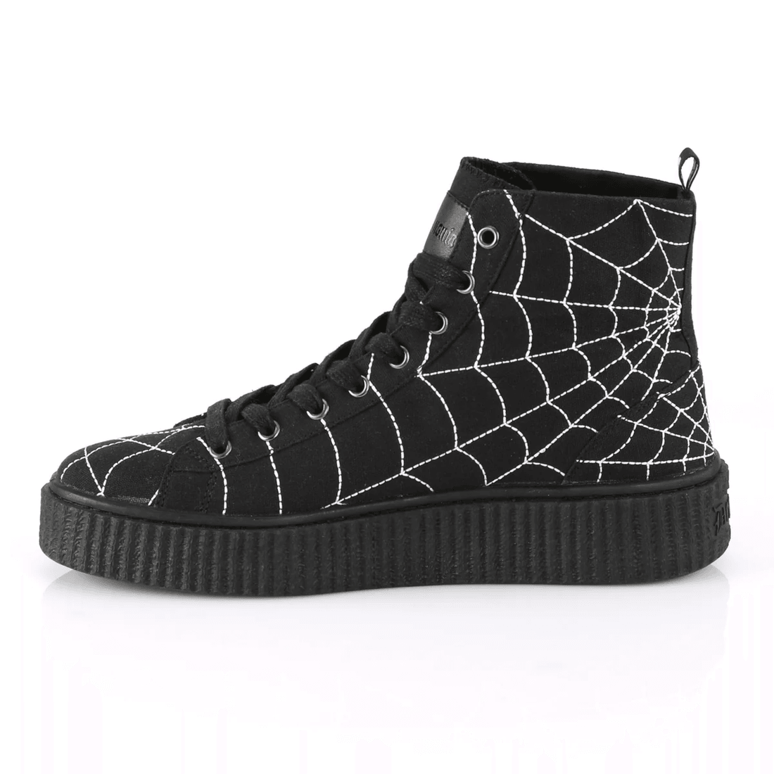 The Demonia Cult Sneeker-250 features a sleek black canvas upper, perfect for pairing with a variety of outfits. With an approximate calf circumference of 8" and a shaft height of 5", these sneakers provide a flattering silhouette. The imaginative spider web embroidery sets these shoes apart, making them an ideal choice for the adventurous spirit seeking to express their individuality.