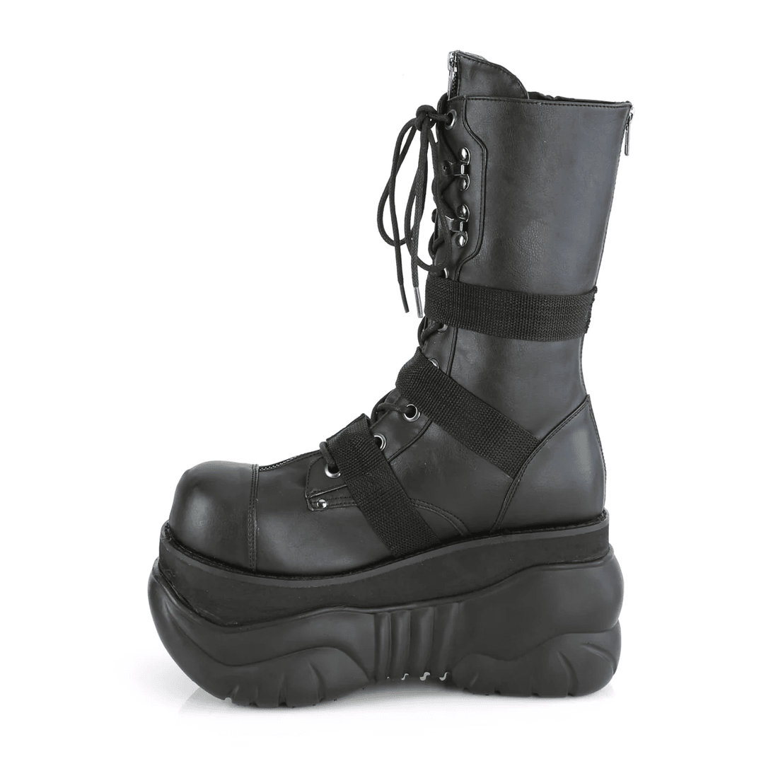 škornji demonia Cult Boxer-230 črni Vegan Usnje Združujejo Drzne Estetike S Funkcionalnostjo. Tri Najlonske Zaponke Dodajo Uporniški Pridih, Medtem Ko Okrasne Zadrge Na Ježku In Zunanji špici Izboljšajo Edinstven Stil. Z Robustno 4" Platformo, Ti Vezalni škornji Ne Le Da Dvignejo Vašo Višino, Ampak Tudi Vašo Modno Igro.