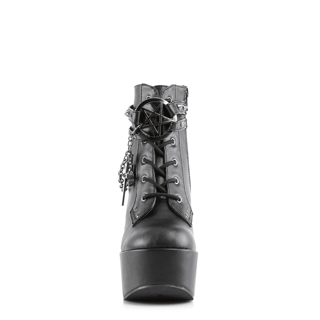 demonia Cult Poison-101 čizma Do članka Nije Samo Izbor Obuće; To Je Izjava. Sa Obimom Lista Od Približno 9.3" I Visinom Okvira Od 6.8", Ove čizme Su Dizajnirane Da Se Udobno Uklapaju Dok Prikazuju Vaš Jedinstveni Stil. Kombinacija Detalja Sa Pentagramom I Ukrasima čini Svaki Par Jedinstveno Vašim.